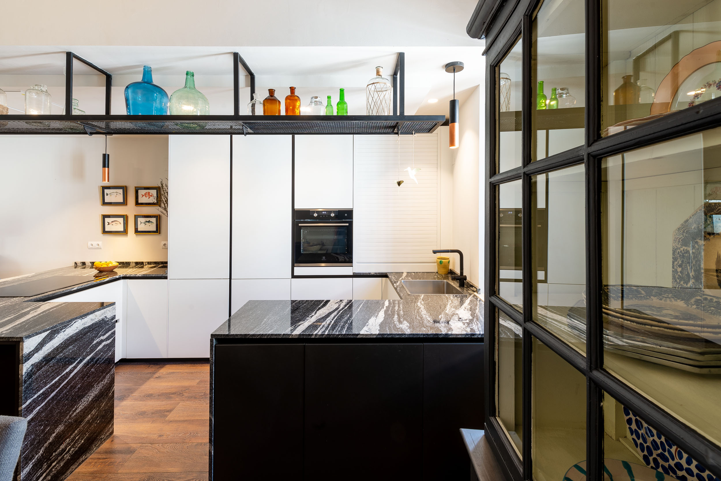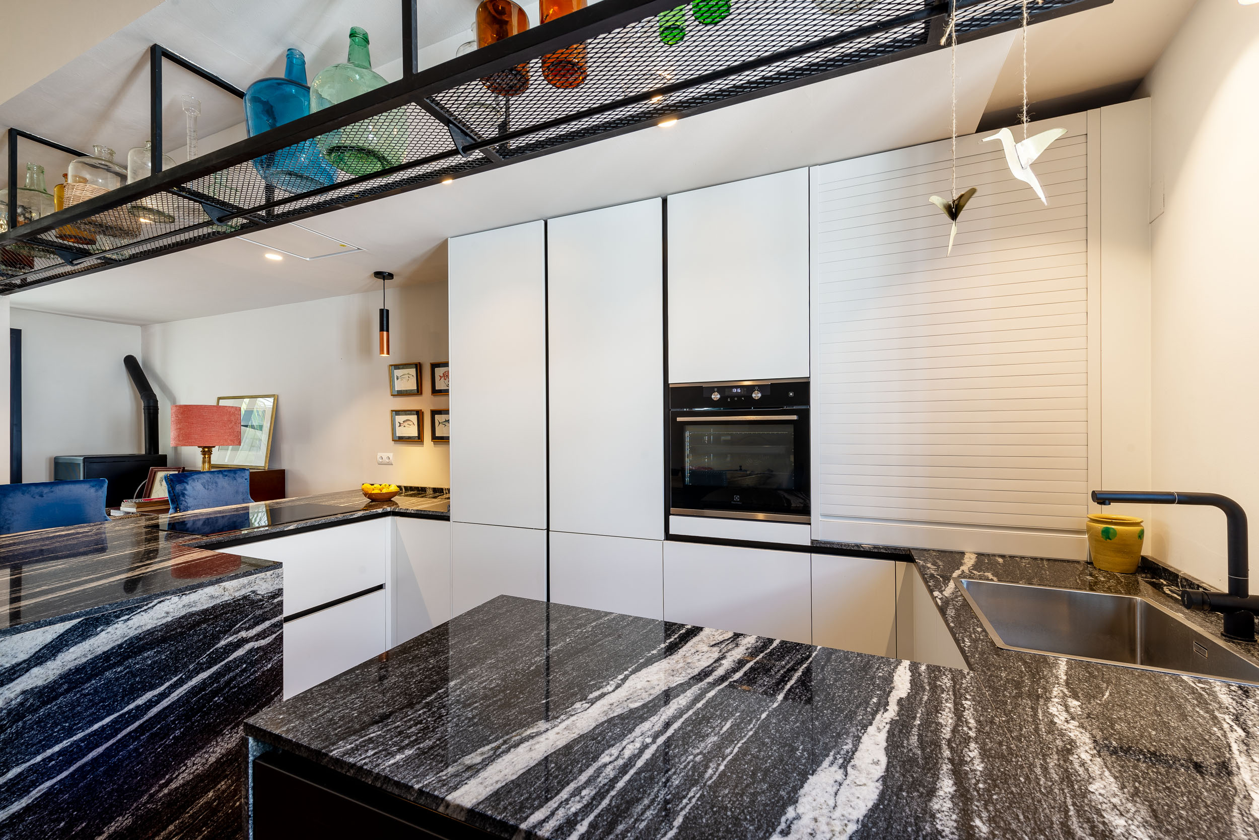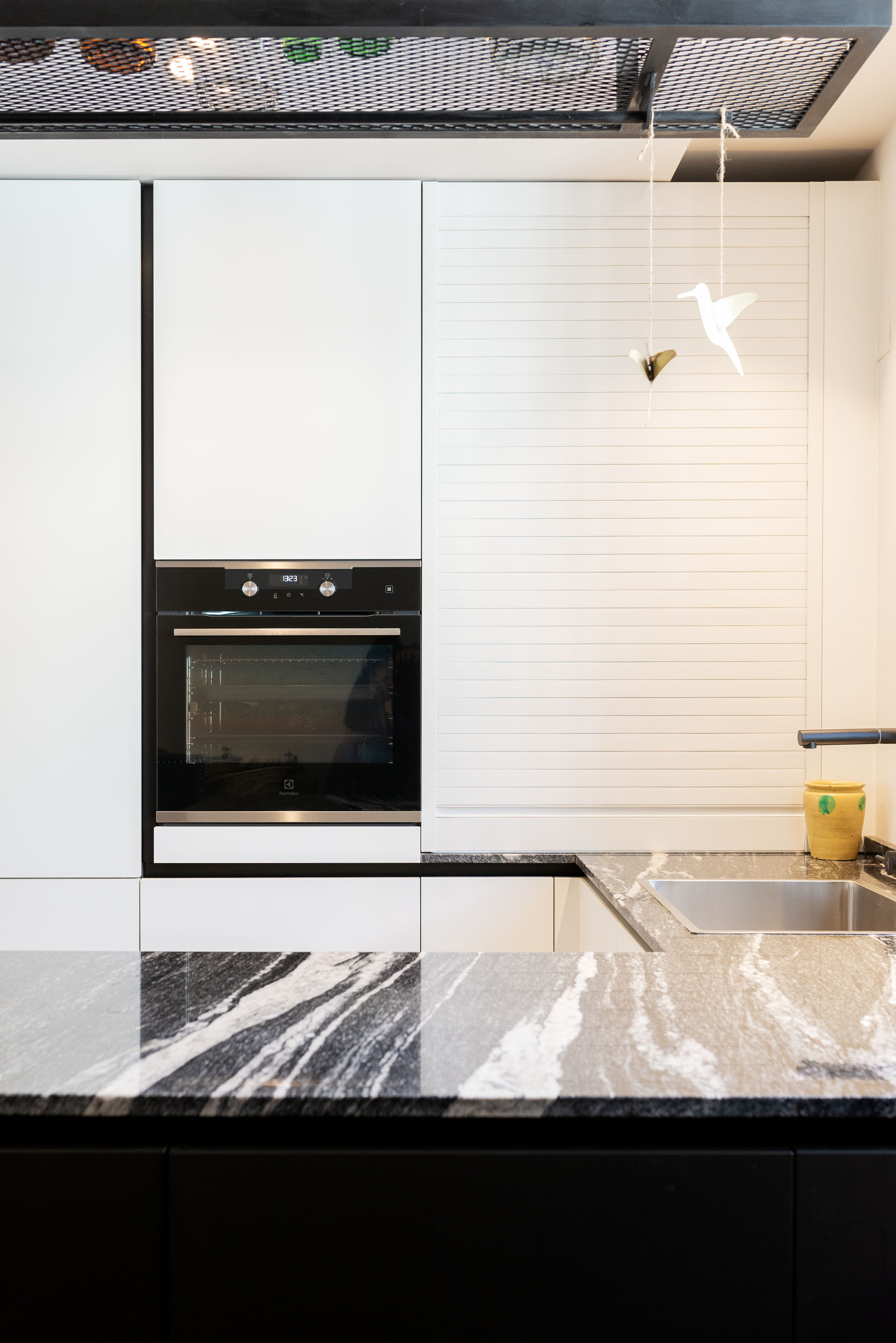 La cocina de Ariana tiene perfil Step, acabado de gola y zócalo de aluminio Brunito. Las puertas de los muebles son Tecnolux Bianco / Lacado sand Negro. Pasamos a la encimera que es de la firma Sensa, modelo Black Beauty. Los electrodomésticos elegidos los firma Electrolux.