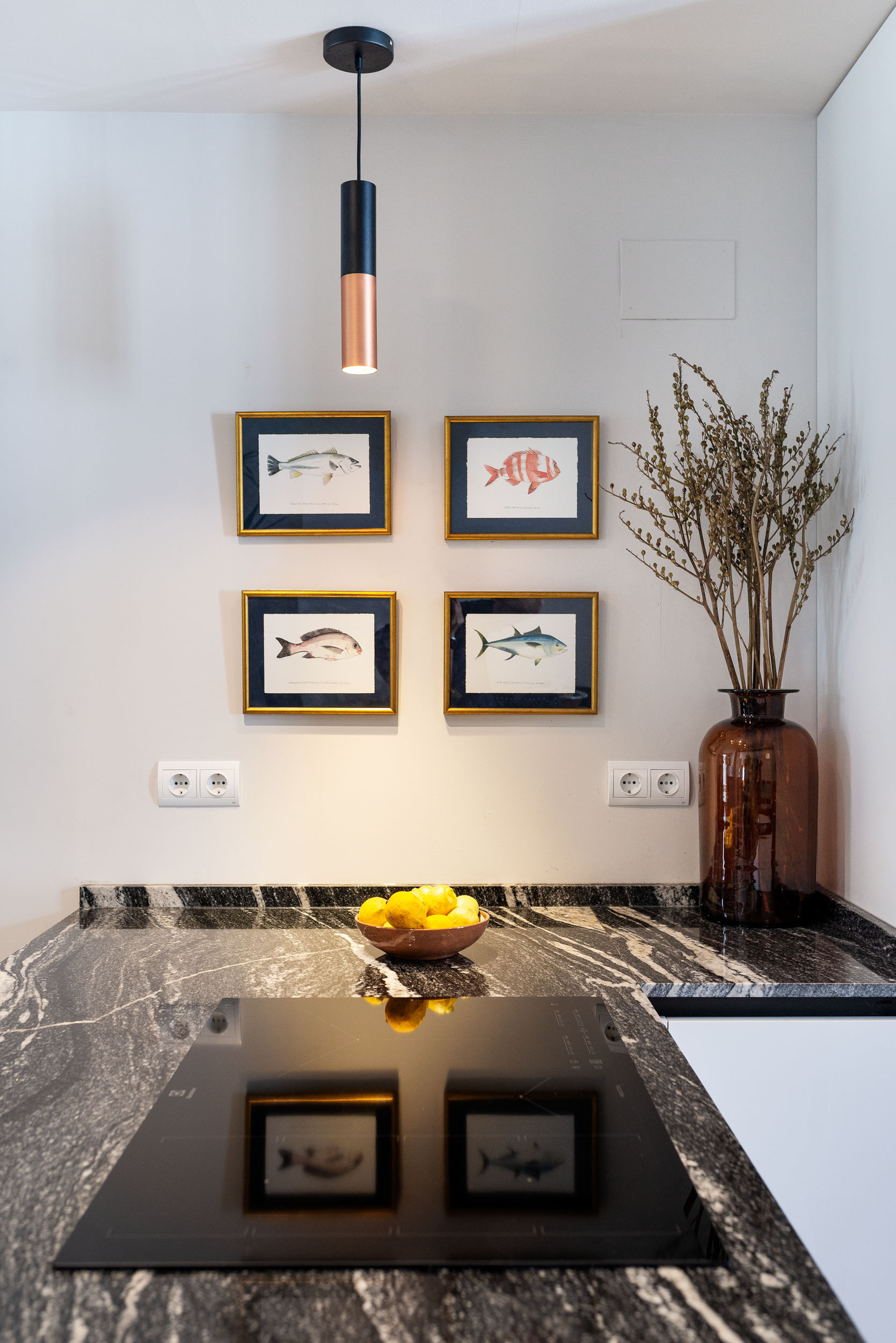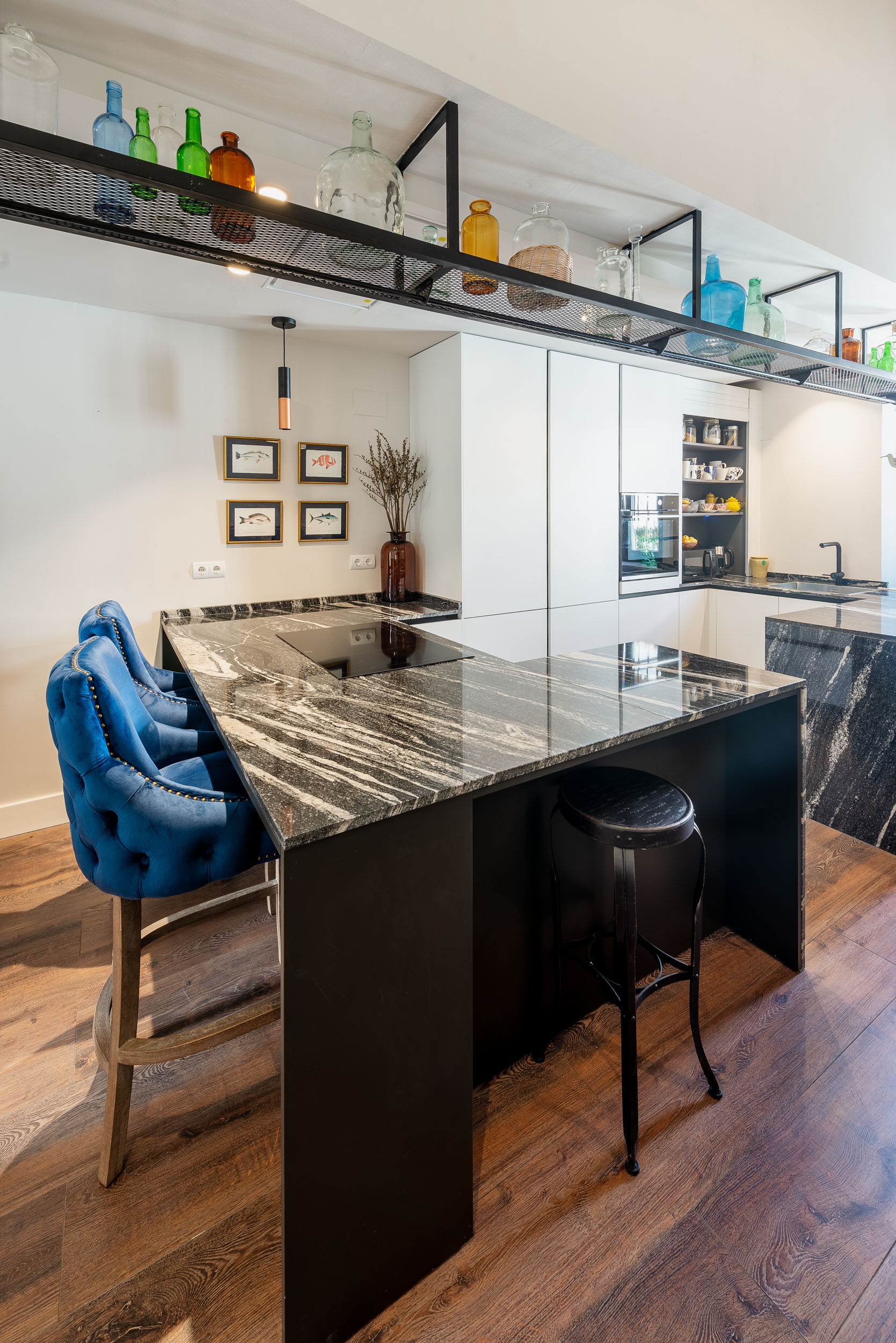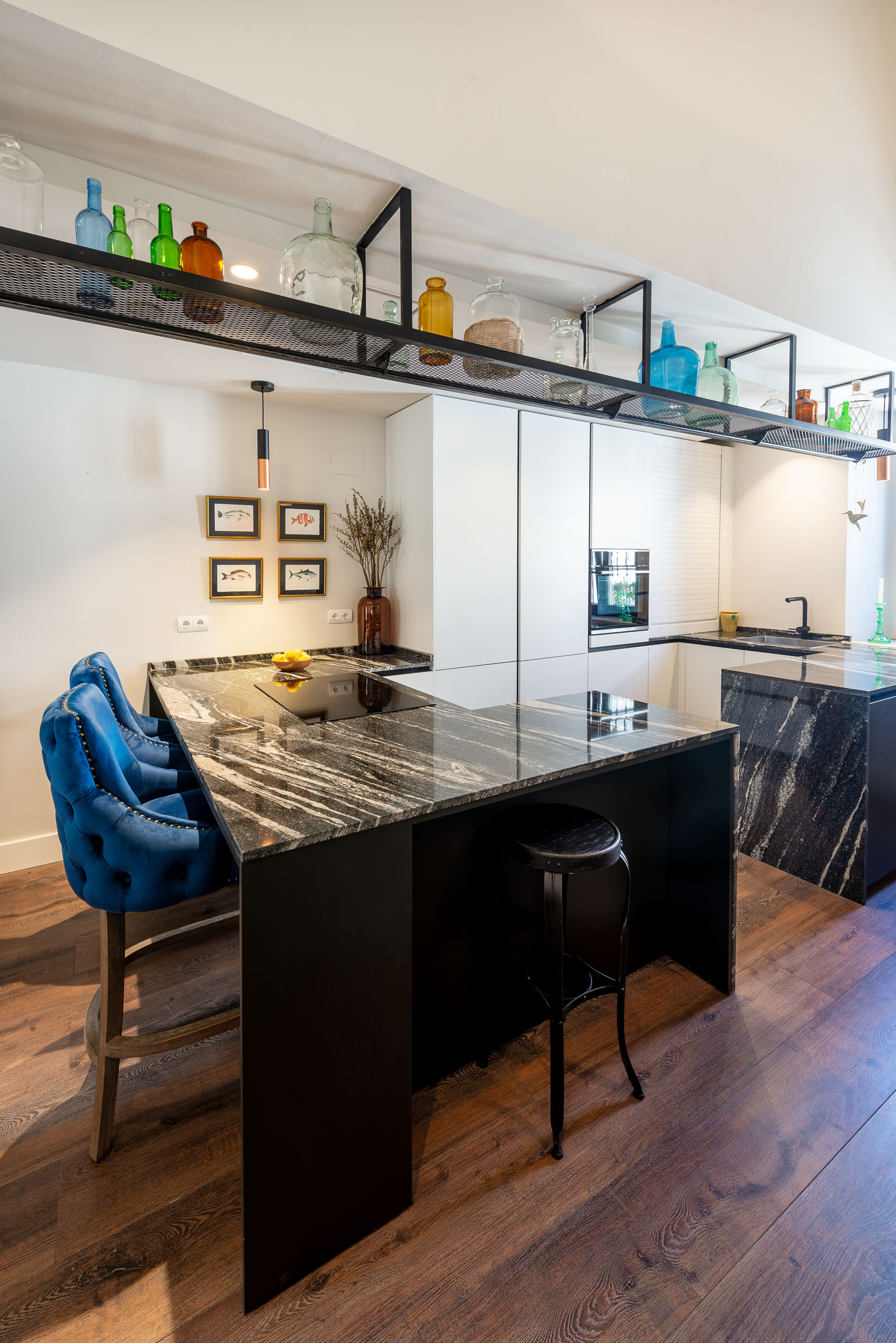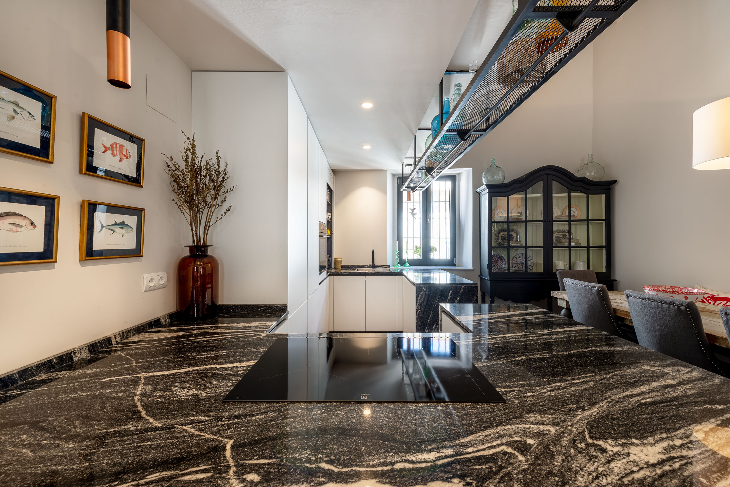 La cocina de Ariana tiene perfil Step, acabado de gola y zócalo de aluminio Brunito. Las puertas de los muebles son Tecnolux Bianco / Lacado sand Negro. Pasamos a la encimera que es de la firma Sensa, modelo Black Beauty. Los electrodomésticos elegidos los firma Electrolux.