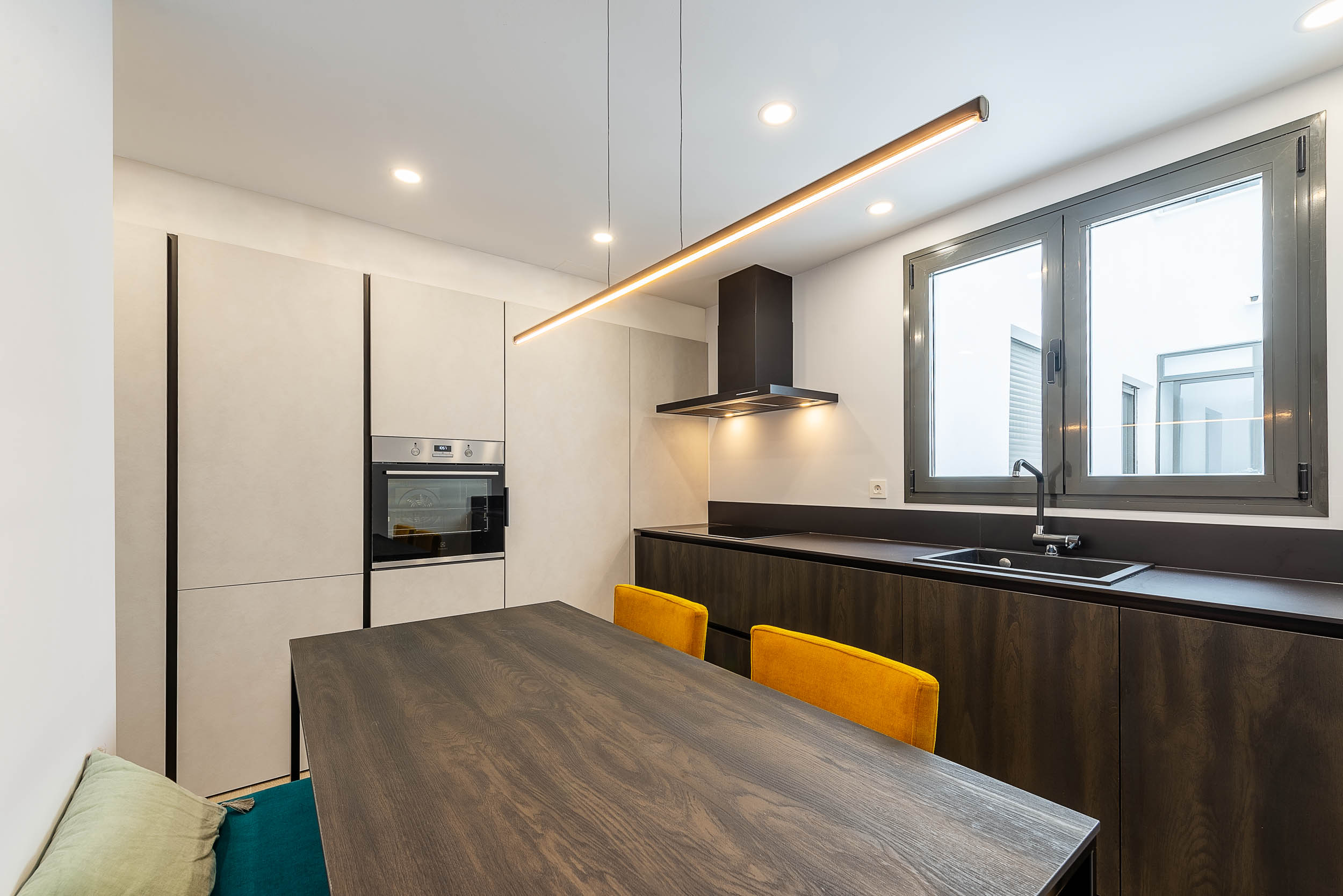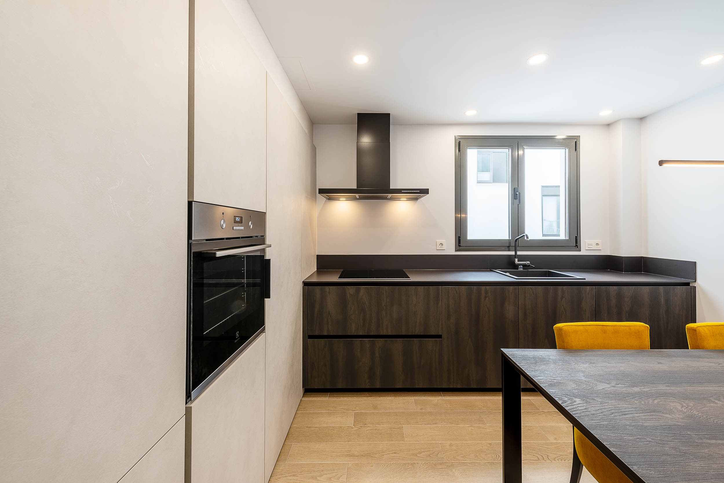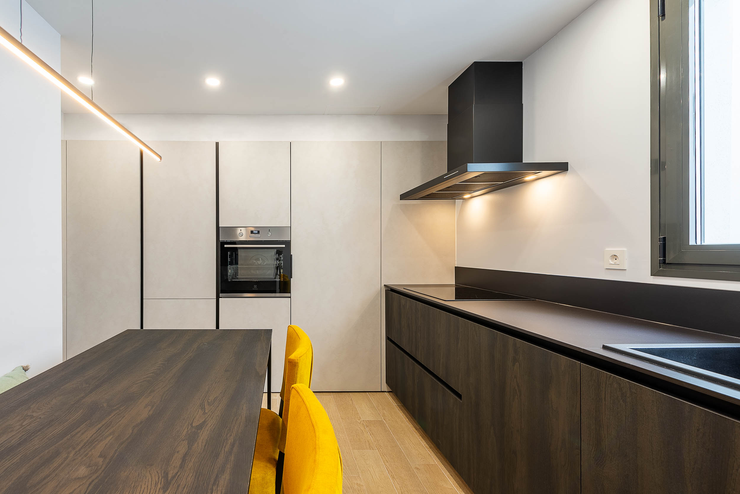La cocina de Sergio tiene como base gola curva y zócalo de aluminio acabado Brunito. Los acabados de los muebles consisten en Laminado Materico 45 / Sabbiato Moro. La encimera es de la firma Laminam y el modelo es Nero Absoluto mientras que los electrodomésticos elegidos fueron Electrolux.